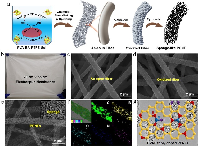 图1. B-N-F三元掺杂的通体多孔碳纳米纤维的制备与表征。(a)使用化学交联静电纺丝和高温煅烧法合成多孔碳纳米纤维的示意图;(b)前驱体纤维膜;(c-e)依次为前驱体纤维,预氧化纤维和多孔碳纳米纤维的扫描电子显微镜图;(f)多孔碳纳米纤维的EDS谱图;(g)B-N-F掺杂的碳纳米纤维结构模型。