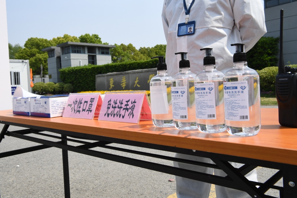 在宿舍门口的体温检测点,学生再次出示校园卡、绿色“随申码”,递交承诺书,体温正常便可顺利回到温馨的“家”。“1+7+1”的“东华牌”健康包一定会彻底暖到好久不见的你!1支水银温度计,7片口罩,1份防疫温馨提示,两个字——实用!