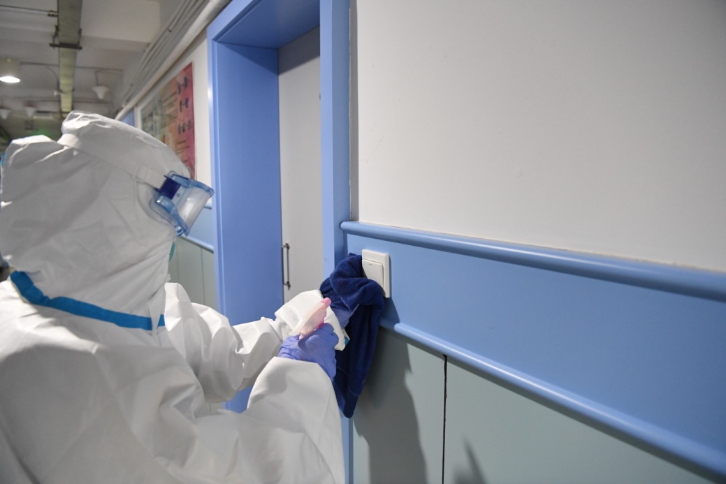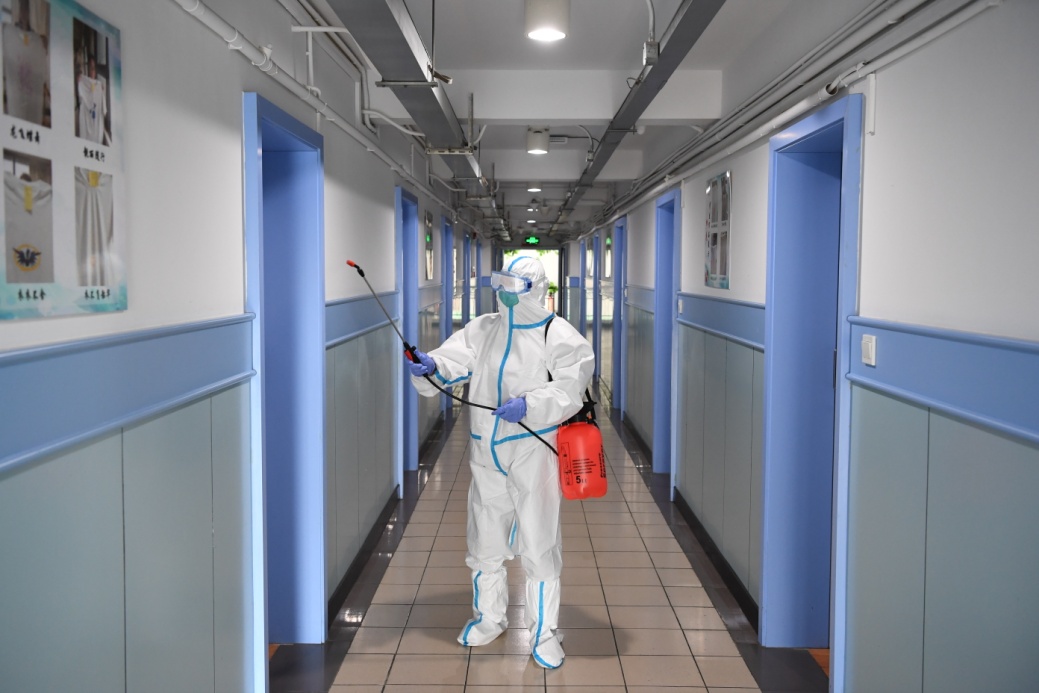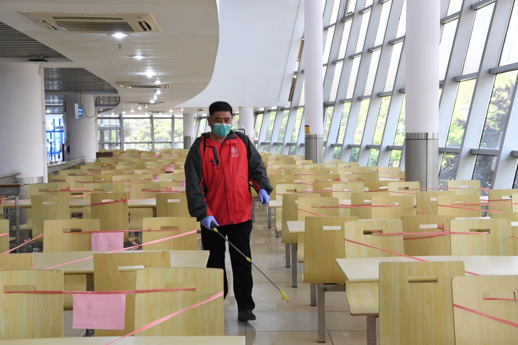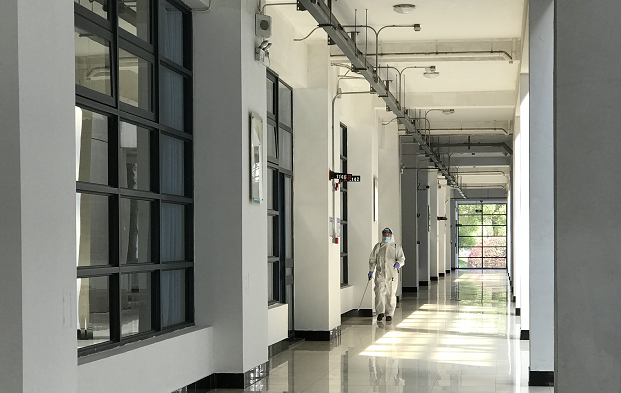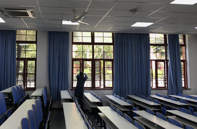 工作人员在松江校区教学楼内进行消杀作业