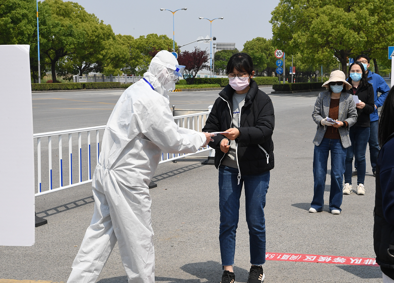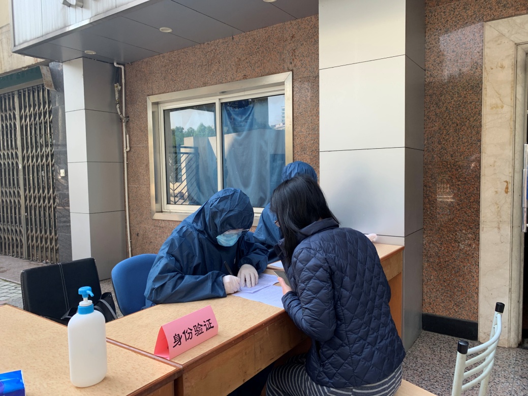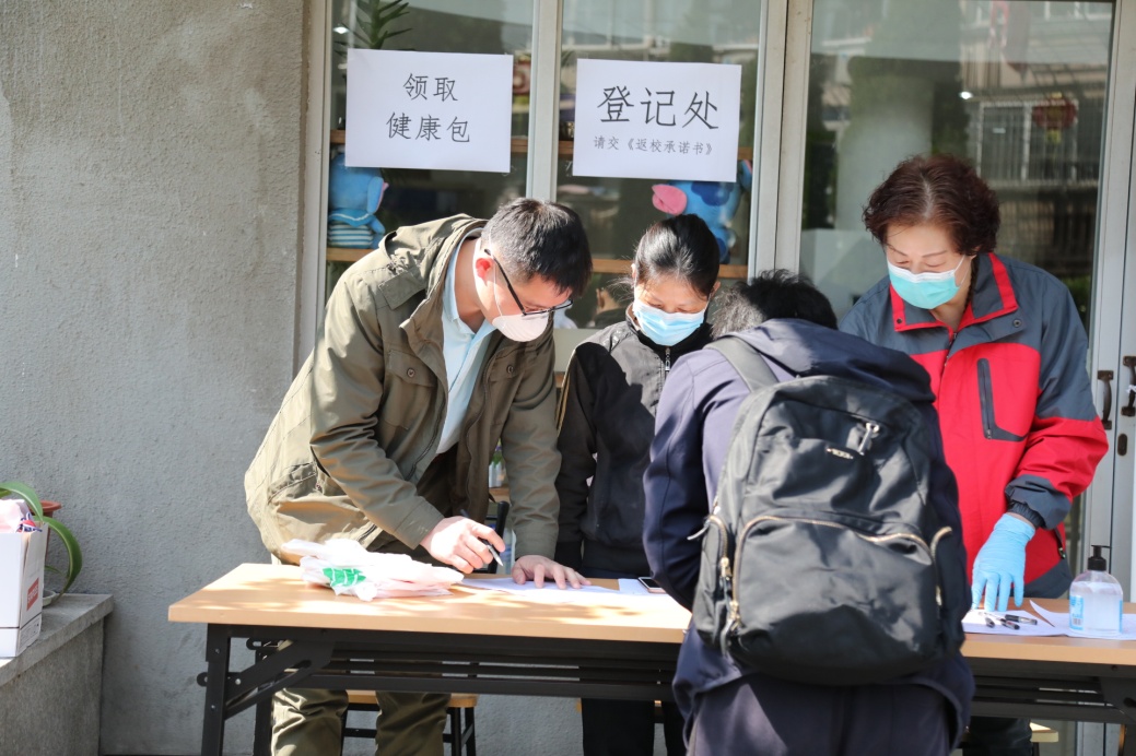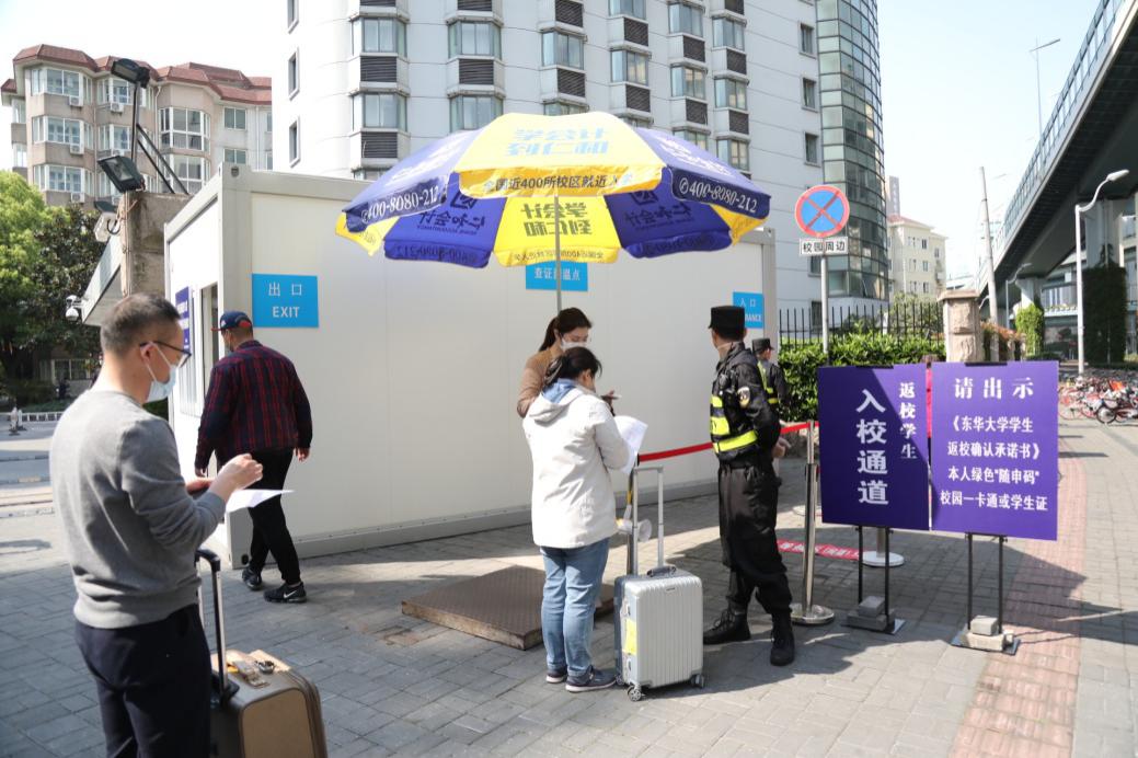在校门口,“学生”们带着“行李”间隔1.5米有序排队等候验证、测温,工作人员逐一查验校园卡、随申码、返校承诺书等。