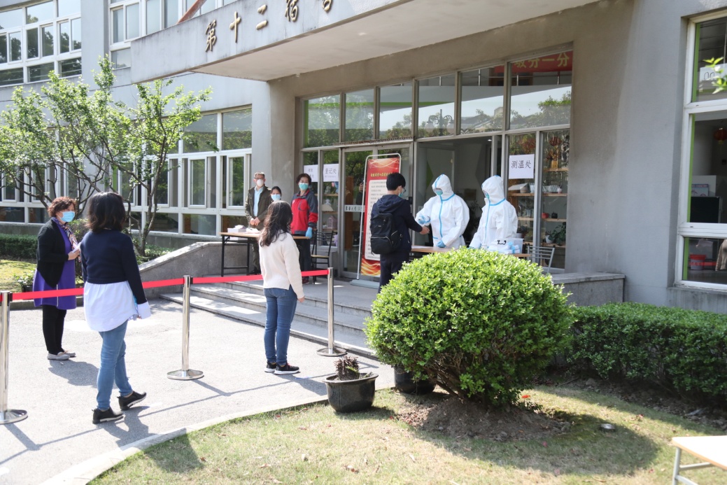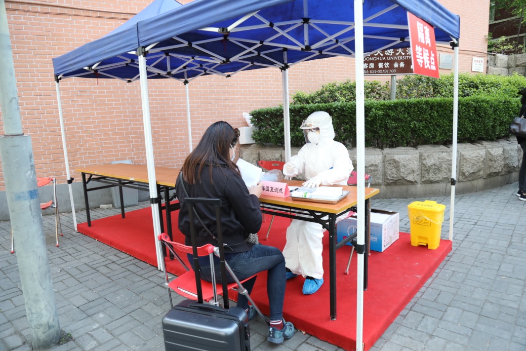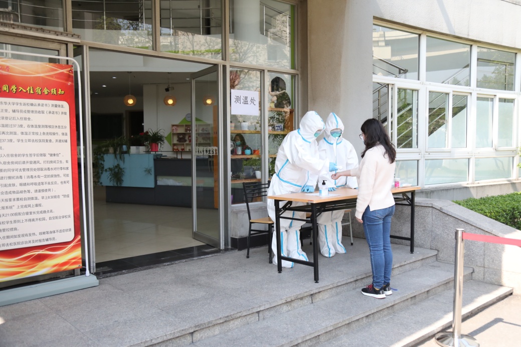 学校在延安西路、广富林路和文汇路校门统一设置了返校学生入校通道、体温复测点和留观等候点。当学生体温超过37.3℃时,将被带至指定复测点,若复测体温仍不合格,工作人员将把学生引导至留观等候点,同时启动体温异常者处置流程。针对来自重点地区的学生,学校设有专属通道,体温检测正常者将进入指定场所进行健康观察和检测。