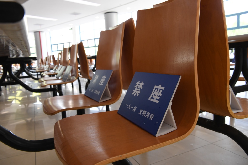 “一人一桌,在此就座”的餐桌提示,窗口前“一米线”的可爱地贴尤为醒目。在食堂入口处,拉设了排队引流线,实行单向限流管理。疫情期间,为减少交叉感染风险,食堂实行错时、错峰就餐,师生凭个人有效证件经测温合格后,方可进入用餐,确保安全有序。“一人一桌,相隔一米,同向就餐”的原则,很快就会变成大家的好习惯。