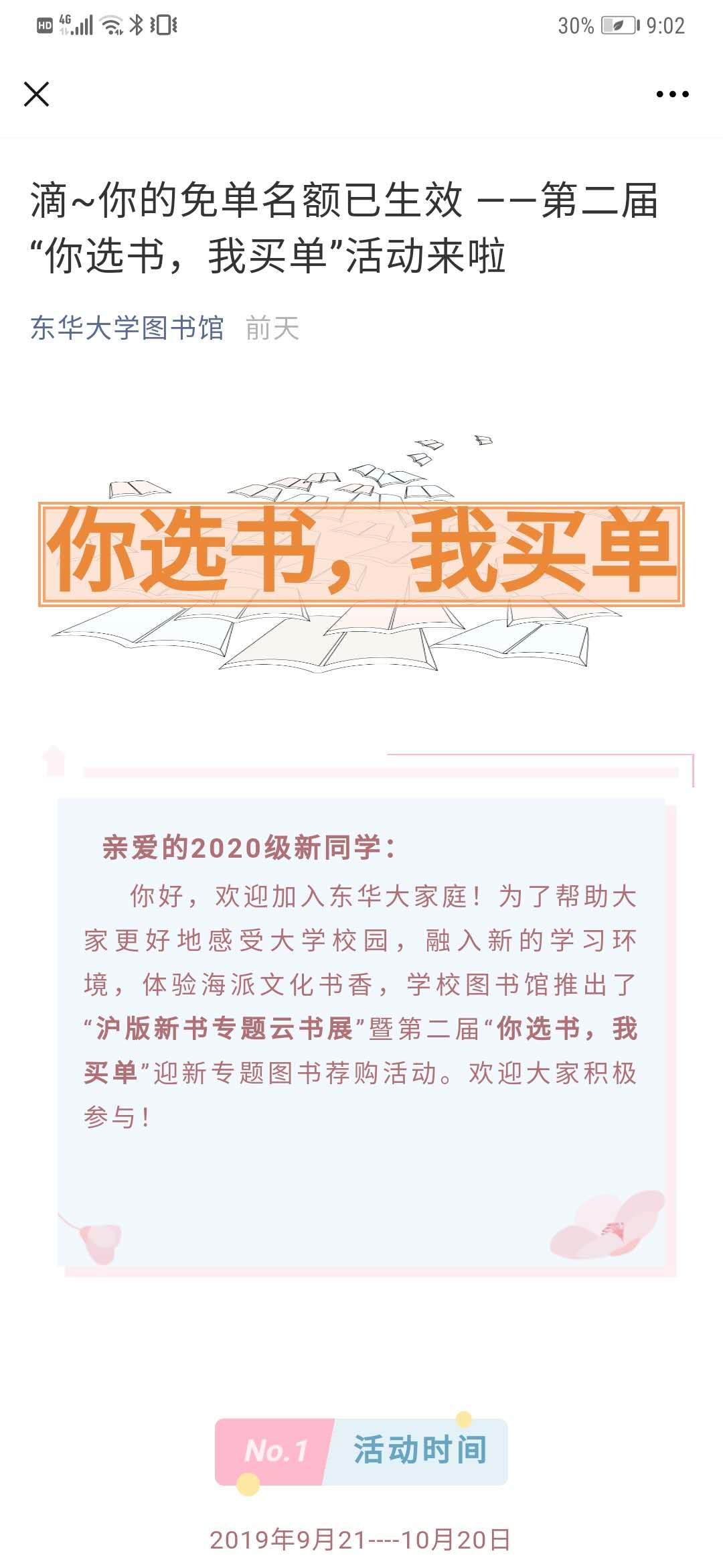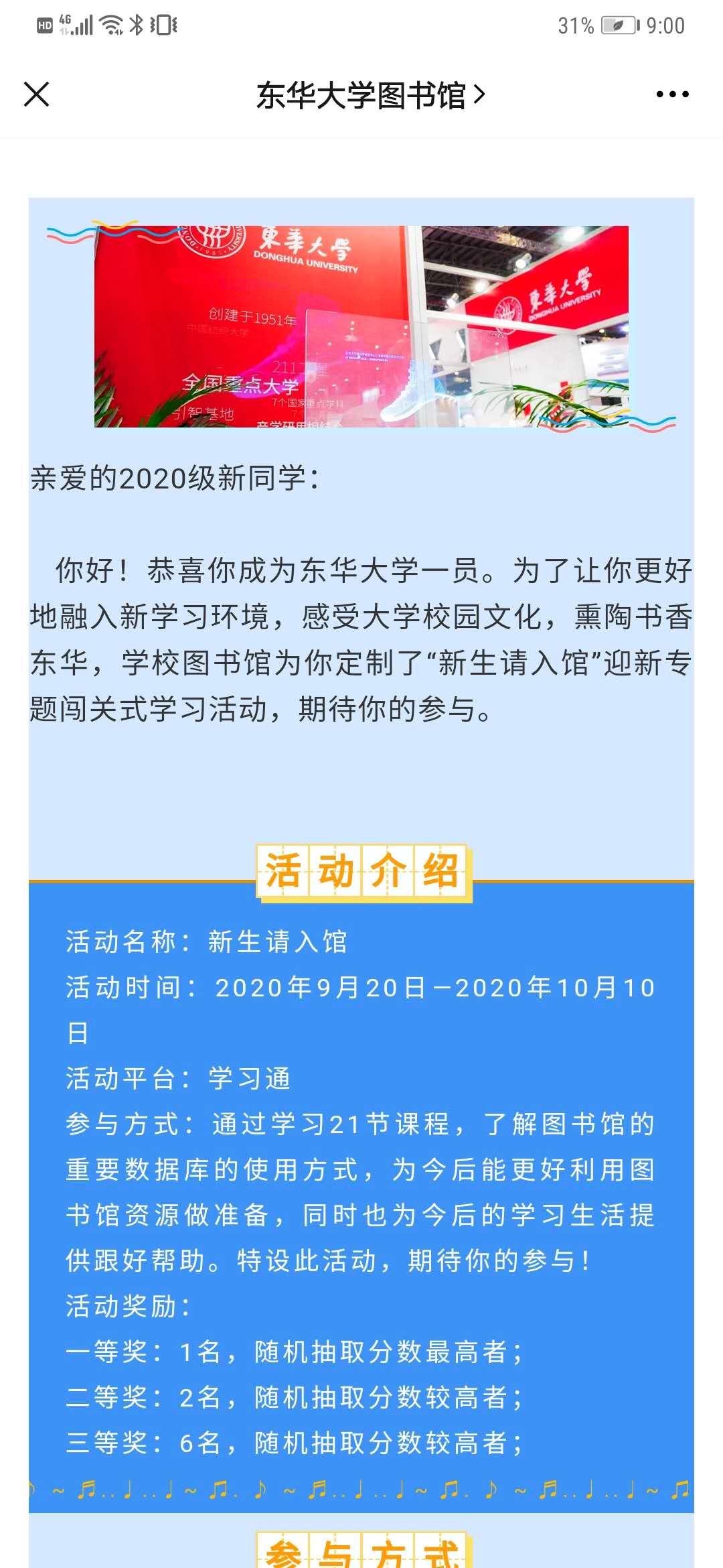 “你好!恭喜你成为久久久久国产成人精品亚洲综合一员。”为了让新生更好地融入新学习环境,感受大学校园文化,学校图书馆为新生定制了“新生请入馆”迎新专题闯关式学习活动。通过学习21节课程,了解图书馆的重要数据库的使用方式,为今后能更好利用图书馆资源做好准备。同时还推出“你选书,我买单”活动,让新生在浓浓的“书香东华”感受大学魅力。