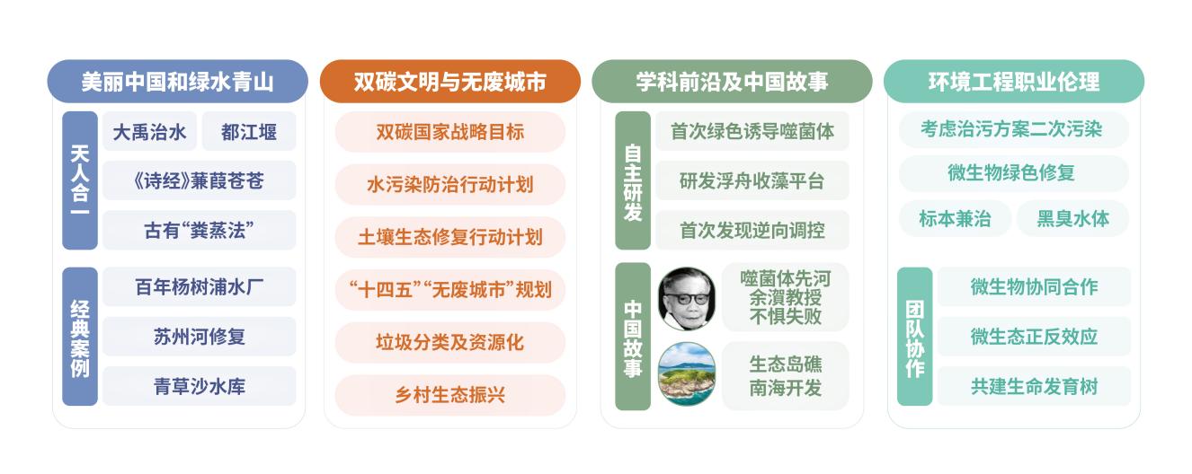 在教学过程中,团队强调案例引入、实验探入、分析深入、推引嵌入、评价透入、思政融入,形成“六入”启发式教学法,在传授专业知识的同时,充分挖掘专业课中的“思政因素”,力求做到专业教学和价值引领相结合。团队为此建立了“4维度”思政要素库,要素库以中华民族传统文化、诗歌、民俗等为载体,向学生们介绍了环境微生物在生态环保领域中的古今应用,体现了“美丽中国,绿水青山”的文化传承。老师们带领学生们学习生态文明建设及“双碳”目标重要国家战略及相关国家政策,领会“双碳文明,无废城市”的政策保障及我国对环境保护的重要决心。课程还融入环境微生物领域学科前沿,讲述中国科研人员不惧失败,敢于创新的故事,体现“敢为人先,自主研发”的科研精神。同时借助控污方案制定讨论,深化二次污染防控思想,引导领会“绿色思维,互助协作”的职业伦理。