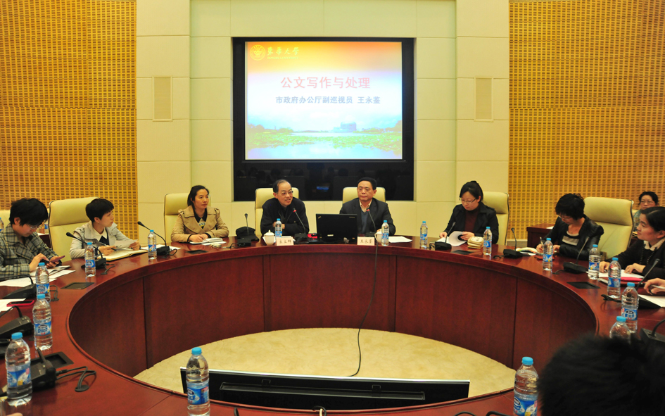 4月15日,上海市政府办公厅副巡视员王永鉴应邀为我校第十期青年骨干培训班学员作“公文写作与处理”专题讲座,副校长宋立群出席并主持。各学院、职能部门办公室主任及信息员等参与培训。