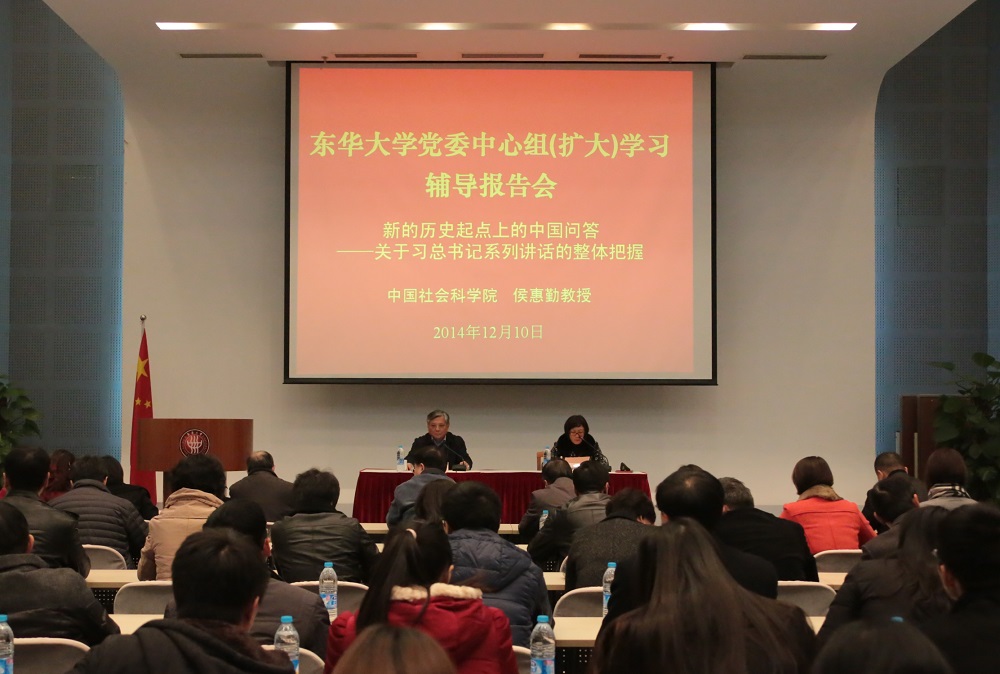 12月10日,学校在松江校区举行中心组(扩大)学习会议,中国社科院侯惠勤教授受邀作题为“新的历史起点上的中国回答——关于习近平总书记系列讲话的整体把握”的辅导报告。校党委书记朱民,校长徐明稚,党委副书记刘淑慧,党委副书记、纪委书记罗仪华,副校长宋立群、刘春红,校党委常委袁孟红出席。刘淑慧主持会议。