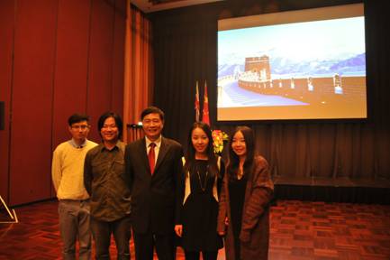 (图:中国驻新西兰大使徐建国接见我校获奖师生。左起:杨上、周洪雷、徐建国、马玉儒、吴攸攸)