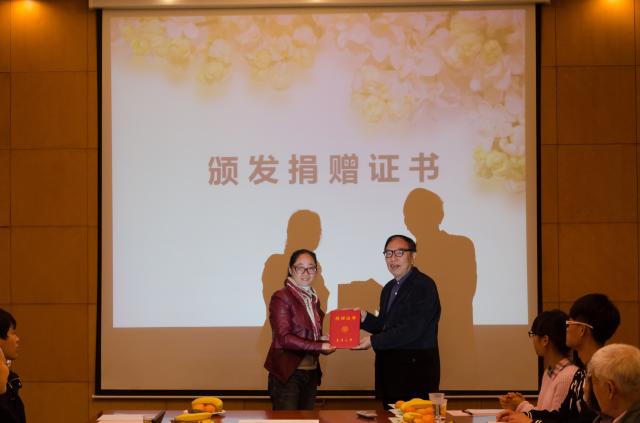 档案馆馆长沈洁向曹凤山教授家属代表曹子平(六子)颁发捐赠证书