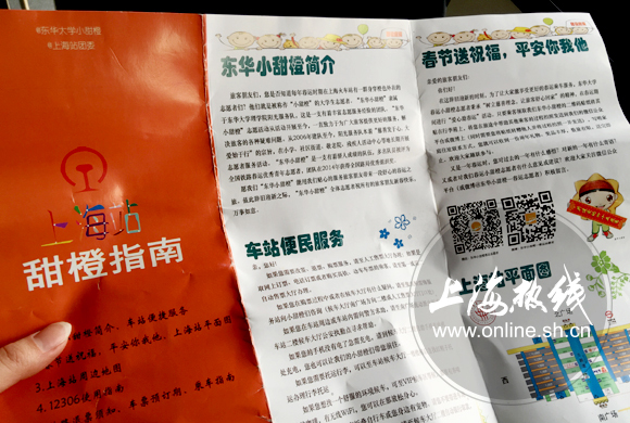 今年东华“小甜橙”主要服务于铁路上海站安检处、服务台、扶梯口、军人老幼候车室、广场岗亭等九个岗位。他们编印了一本《东华甜橙指南》将在铁路上海站免费发放。这本小册子里汇总了旅客们最迫切想了解的信息,其中包括铁路上海站车站地图、车站各部分功能介绍、车站周边地形图、12306网站网址、手机客户端二维码、12306使用简介等实用内容。手握这本《东华甜橙指南》,旅客们可以按图索骥快速找到问题的解决方法,少了一丝麻烦。