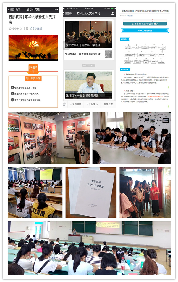 这是我校近年来上好入党第一课的新举措,除了专职党务工作者和辅导员参与入党启蒙外,积极吸引特邀党建组织员和关工委讲师团的老教师参与其中,加强工作力量,做到入党启蒙全覆盖。12位特邀党建组织员分别为各自学院全体新生做入党启蒙,并在日常学习生活中用丰富的人生阅历和对党的深厚感情感染新生,使新生对中国共产党有了初步正确的认识;关工委老教授也结合入党启蒙开展相应的宣讲,给新生做《让青春在党旗下生辉》《社会主义核心价值观引领人生》等专题讲座,帮助新生坚定共产主义信仰,扣好人生的第一粒扣子;老教师们还结合新生参观校史馆,现场讲解校史校情、校训和东华精神,激发新生爱校荣校的感情,努力在大学里取得学业进步和政治思想进步双丰收。