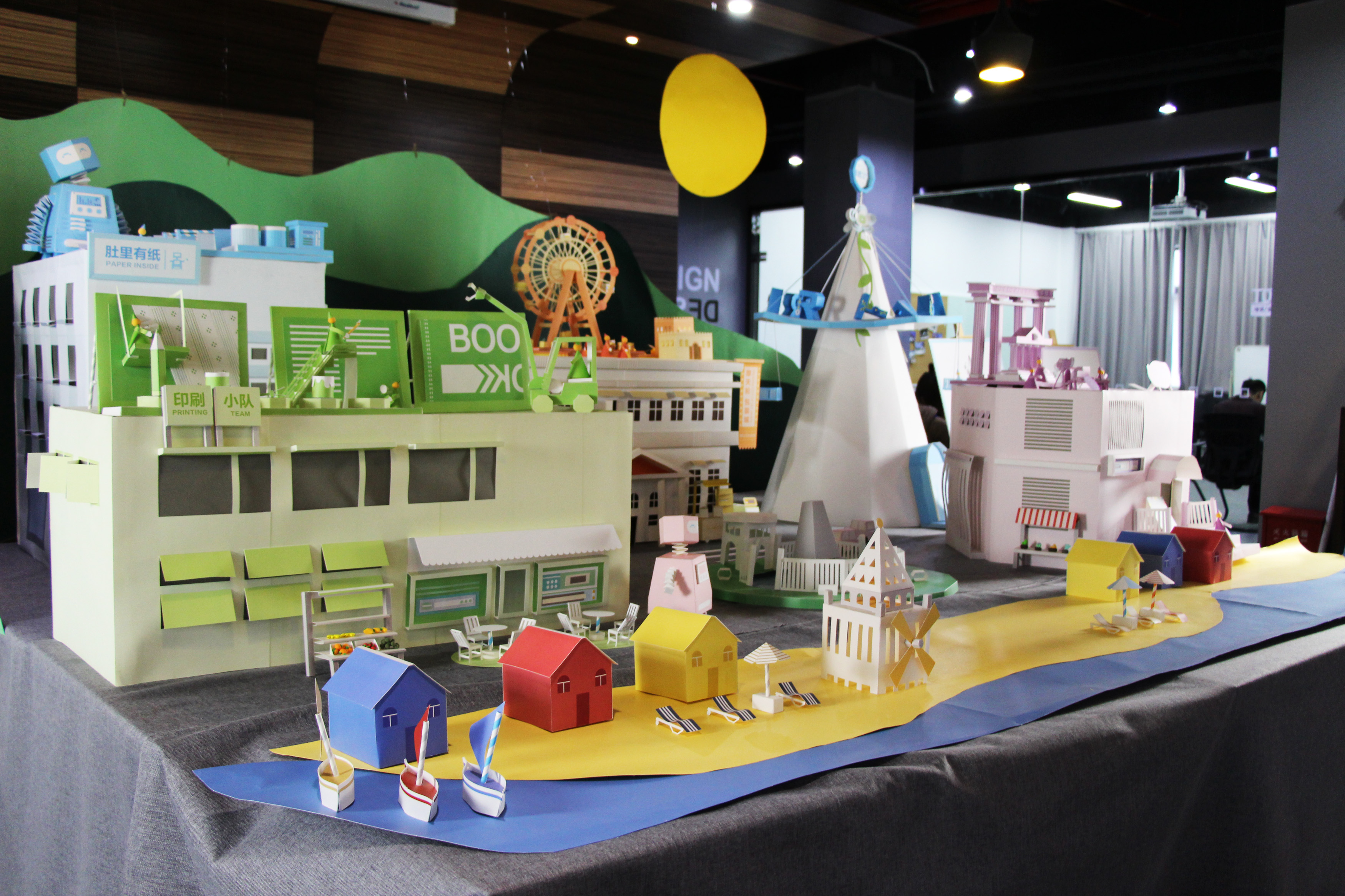 折纸一定是大家童年的回忆,纸飞机、天鹅还有小兔子你们肯定都叠过,可是谁都没有用纸做过城市吧,沙滩椅、印刷厂还有这个精致的摩天轮,很难想象这个城市居然是用纸张一点一点做出来的。