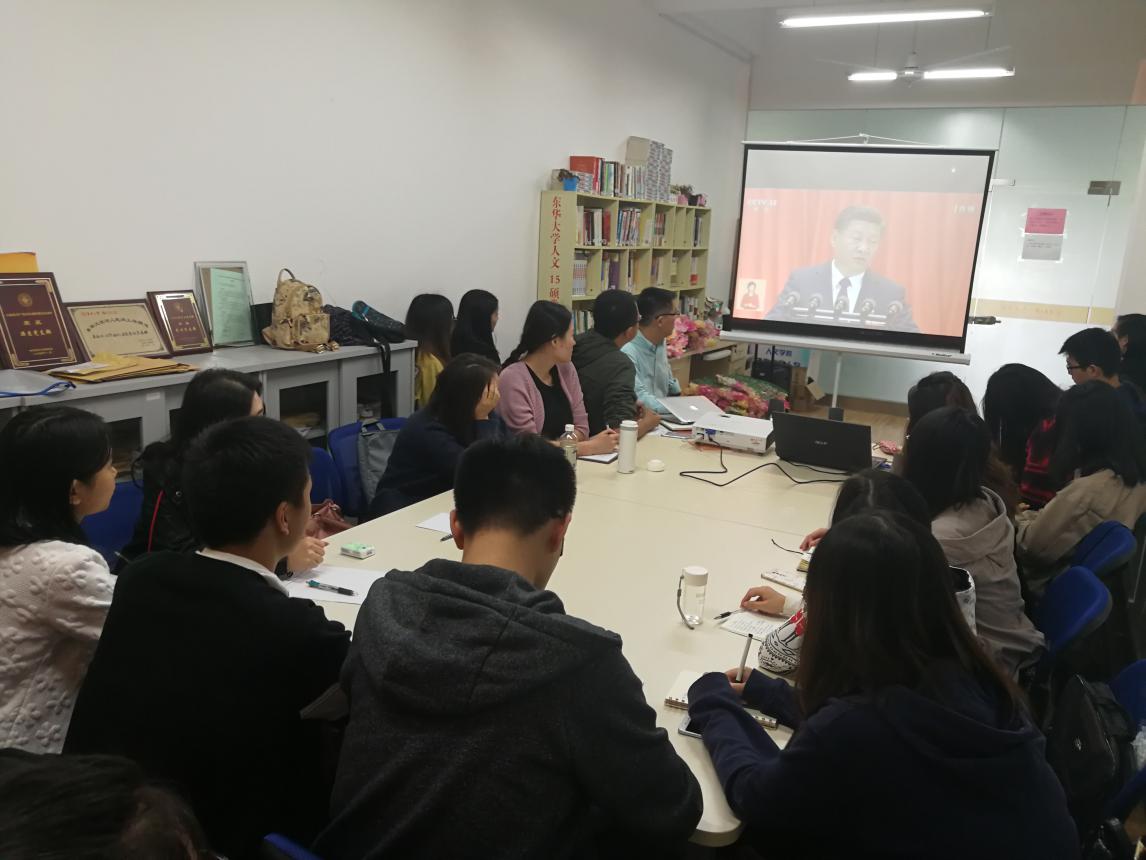 10月18日,人文学院党委组织学院师生党员、青年团员深入学习党的十九大精神。上午9点,学院各教工党支部、学生党支部以及各团支部在学院党委的统一组织下,在学院楼、综合楼、学生宿舍区等地集中观看十九大开幕会直播,并开展形式多样、内容丰富的线上线下主题学习讨论活动。下午3点,学院召开党委中心组扩大会议,校党委副书记刘淑慧与学院党政负责同志、教授代表、辅导员代表等共同围绕党的十九大报告全文进行深入学习和交流研讨。