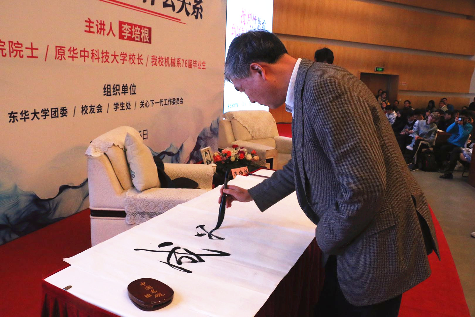 讲座结束后,李培根院士接受了访谈并与同学们进行了互动,现场提问踊跃,气氛热烈。李培根院士对于批判性思维、科学技术发展和当代教育规律的深入思考引发现场师生强烈共鸣,报告会现场不时响起热烈掌声。讲座最后,李院士亲笔题词“成为你自己”,赠予东华学子,并建议大家“按自我的思维,做好我们自己”。