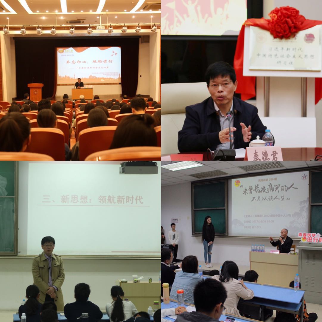 系列讲座先后邀请松江区委党校副校长、松江区行政学院副院长陈超带来讲座“新时代、新思想、新征程与当地青年的新使命”;2012年感动中国十大人物、知名律师、法官高秉涵带来讲座“未曾长夜痛哭的人,不足以谈人生”;原全国人大代表、全国政协常委兼经济委员会副主任、中国人民政治协商会议全国委员会委员、我校退休教授严诚忠带来讲座“不忘初心,砥砺前行——一个党外老知识分子的心声”;人文学院教授、上海市政治学会常务理事、上海领导科学学会常务理事秦德君带来讲座“面向新时代的现代化战略规划与青年职业规划”;上海市委党校第四分校副教授陈荣武作题为“十九大精神与青年使命”的讲座;上海浦东干部学院教授翁文艳带来讲座“有理想、有本领、有担当——新时代青年的成才之道”;中央马克思主义理论研究与建设工程首席专家、中国科学社会主义学会常务理事、上海师范大学教授汪青松带来讲座“十九大精神与新时代青年的价值认同”;十九大代表、浦发银行上海闵行支行个人银行部经理祝玉婷作题为“青年人,永远在路上”的讲座。