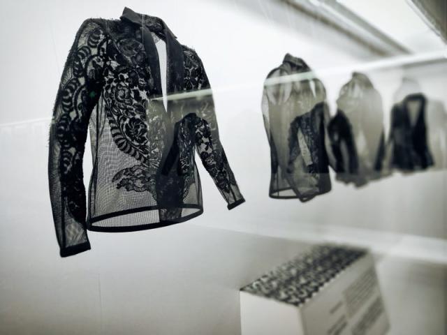 当柔美纤细的蕾丝遇上帅气硬朗的夹克,会碰撞出怎样的时尚火花?本次展览的英方策展人、爱丁堡大学艺术学院时尚学部主任Mal Burkinshaw告诉记者,2014年他参观上海的纺织品和服饰博物馆,中国传统服饰精湛的细节和工艺让他印象深刻,蕾丝夹克的创意在他脑中萌发,最终耗时1300多个小时打造了这一系列独具特色的创意蕾丝夹克。