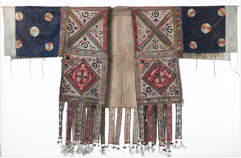 “这件牯臟衣是苗家在过牯臓节时,苗族牯臓首领在节日中穿着的盛装,是作为宗教仪式中的特殊形式而传承下来的古老苗族服装。”本次展览联合策展人李苏琴指着一件看似稍显陈旧的服饰告诉记者,苗族是一个没有文字的民族,但是服饰同样会“说话”,通过款式和纹饰等特殊“语言”,讲述着苗族古老而悠久的历史文化。这件牯臓服由上衣和飘带两部分组成,衣服形制独特,无领衣、衣身平直、开襟无扣、两侧及袖下不加缝合,袖身正面由蓝靛染亮布缝制,衣身绣满纹饰,有自然界的日月星辰纹、花鸟虫草纹,蕴含着万物有灵的观念和自古传承的特殊含义,体现出古朴神秘的气息。