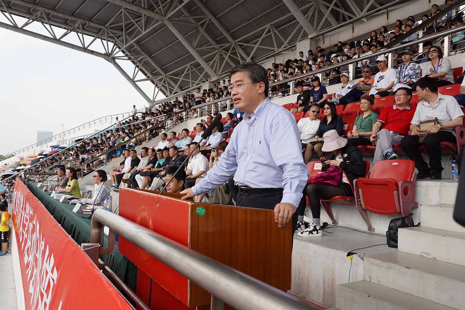 金海燕致开幕辞,代表学校向运动会的召开和体育节的开幕表示祝贺,向各位工作人员、裁判员、运动员表示感谢。他指出,青年人的体质与健康关系到国家和民族的未来,学校一直重视体育教育,有着良好的体育氛围和体育传统。校运会是学校一年一度的体育盛事,是学校体育运动水平、师生精神风貌和校园文明水平的一次集中展示。希望全体运动员发扬“更高、更快、更强”的奥林匹克精神,顽强拼搏,赛出成绩,赛出风格,赛出水平。