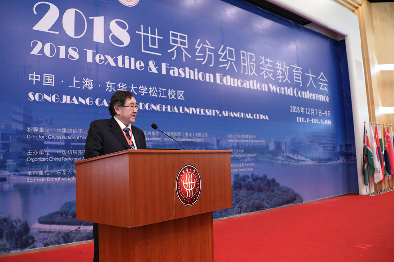 蒋昌俊在开幕式上首先发表了热情洋溢的致辞。他向与会人员简要介绍了学校情况以及近年来实施“三步走”的发展战略。他强调在“双一流”建设背景和全国教育大会精神鼓舞下,学校将以现代纺织科学与工程一流学科建设为抓手,落实立德树人根本任务,努力培养一流人才。他期待与会各方在东华搭建的这个汇聚国际视野的平台上畅所欲言,交流经验,汇聚智慧,深刻理解把握纺织服装教育如何“扎根中国、融通中外、立足时代、面向未来”,在教学模式以及如何建立共赢合作关系等方面取得战略性、引领性丰硕成果,助力中国乃至世界开启纺织服装教育新征程。