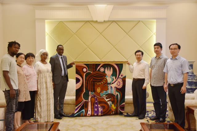 会见结束时,邱为阿萨内佩戴上校友校徽,阿萨内向母校赠送了一张西非文化特色的挂毯。
