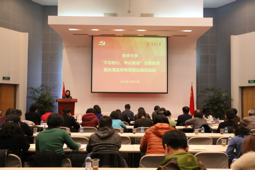 按照“不忘初心、牢记使命”主题教育工作要求,12月31日,学校召开“不忘初心、牢记使命”主题教育整改落实和专项整治通报会。主题教育第六巡回指导组副组长、教育部党建工作联络员刘建中,党委书记刘承功,校长俞建勇,党委副书记崔运花,校两委委员、各二级单位党组织委员会成员、党委主要职能部门负责人、部分“两代表一委员”、院长、教师党支部书记、系主任、专职党务干部和师生党员代表等参加会议。会议由崔运花主持。