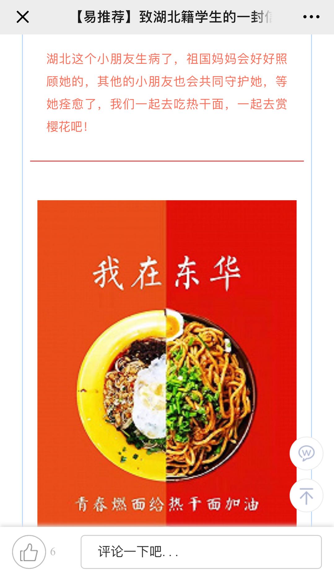 “你不要怕,我也不怕。我们深信黑暗终将消散,光明即将到来;爱和希望比疫情蔓延的更快。”“寒不敌温暖、毒不侵正义。中国加油,武汉加油!”“隔离的是病毒,凝聚的是人心。加油,武汉!我们与你们在一起!”疫情期间,各学院纷纷组织团支部开展“云”主题团日活动,同学们以抗疫祝福、手绘手写、拍摄vlog短视频等形式传递对武汉、对湖北、对中国的祝福和支持,一句句温情的话语、一幅幅原创设计作品、一个个加油视频背后是东华学子们一颗颗滚烫的心,与武汉同胞心在一起,齐心协力,共克时艰,为打赢疫情防控阻击战积极贡献青春力量。