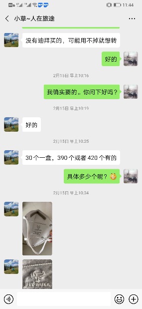 带着这份关注,2月15日上午,一位朋友在微信上发布的专用口罩信息吸引了陈老师。她看后马上联系这位常帮助代购的导游朋友,得知这是一批采购自迪拜的N95口罩,400只起拿,420只全要,30元一只。“怎么了,你自己用吗?”“准备捐武汉。”陈老师简明回复后,就为是否购买焦虑起来。“我担心是假货,但想着如果能采购到这批N95,寄给一线医护人员,又心动了……”