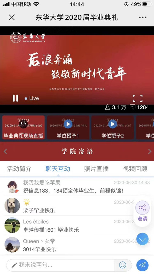 外语学院毕业生刘家豪这次由于疫情原因在家里参加了整场活动,他在朋友圈里这样分享道:“好想回校把学士帽高高地抛起来,虽然没能现场参加,但这场超有仪式感的典礼弥补了心中的小缺憾,也带给我们惊喜与感动!全方位的移动直播,即使隔着屏幕,都有种置身其中强烈的代入感,互动评论区热闹得让大家忘了在故乡还是魔都,这样的毕业,意义很特别!”