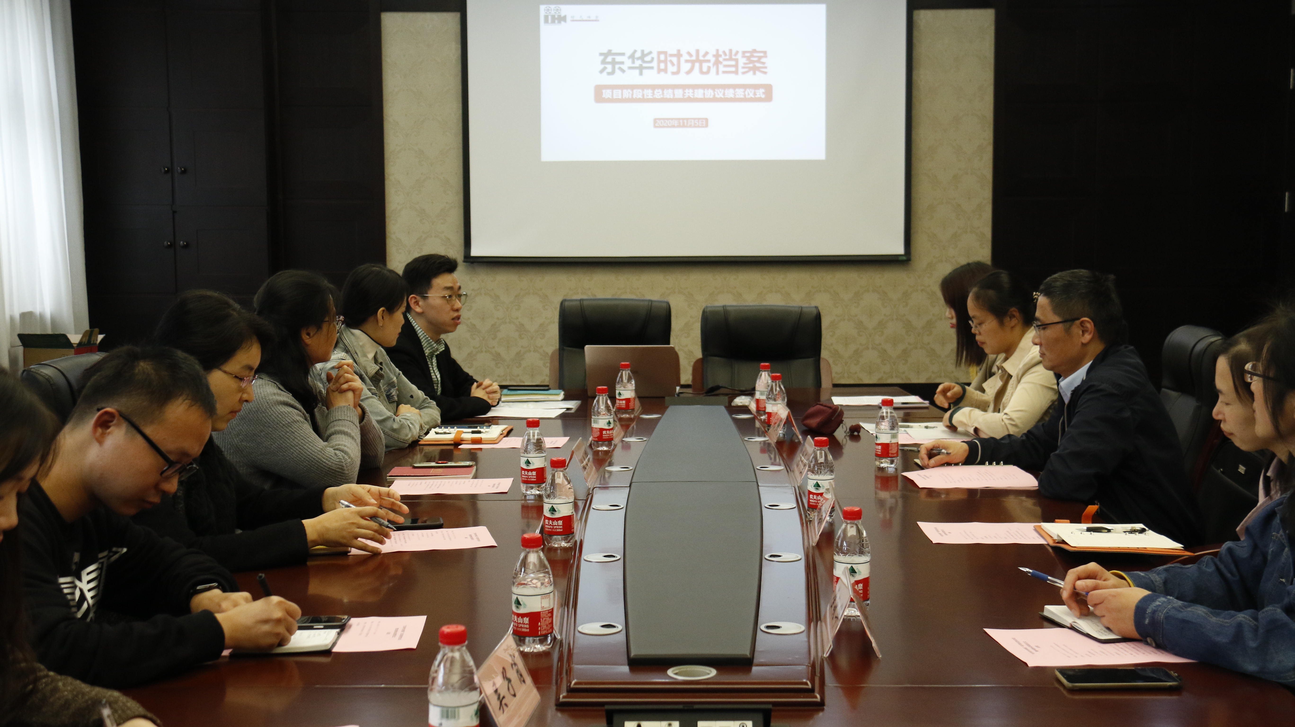 11月5日,“东华时光档案”项目举行阶段性总结暨共建协议(2020-2023)续签仪式。旭日工商管理学院党委书记林文伟,档案馆馆长张千里、馆长助理陶莉,管理学院党委副书记丁怡,项目指导教师以及学生团队代表参加总结交流活动。会议由专职辅导员黄凯聪主持。
