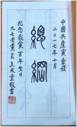 5月11日,学校老干部办公室收到由老同志家属送来的手抄《中国共产党章程》手稿,并附“为纪念党的百年生日,我化时一月有余,写成总纲,以表心意,托人带上”字条。书法作者系我校离休干部王永堂同志,今年97岁,党龄72年。厚厚的手写章程分为上下两册,以篆体书法抄写,用鲜艳的橘色纸张装裱封面,棉线手工装订,这些都是由王老亲手独立完成的。