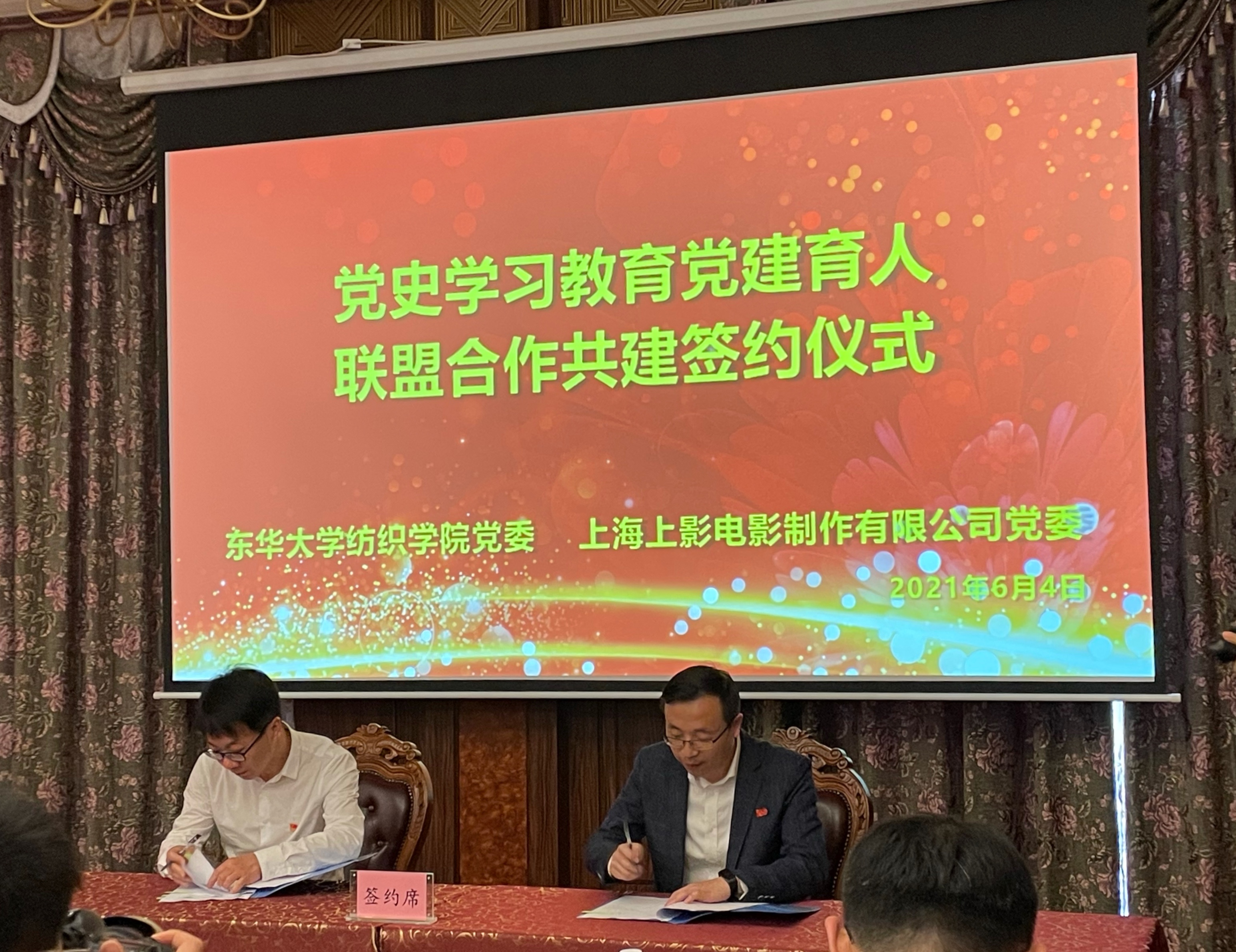 纺织学院党委书记李成龙与上海上影电影制作公司党委书记张乐平就党史学习教育党建育人联盟合作共建协议和大学生志愿服务共建协议进行现场签约。双方表示,将本着“资源共享、优势互补、注重实效”的原则,围绕建党100周年,通过共同夯实组织基础、共同传承红色文化、共同促进改革发展、建立定期联系制度等途径,进一步固本强基、拓展内涵、打造品牌,切实将党建优势转化为基层治理优势和发展动能,实现党的建设与人才培养良性互动,推动“十四五”开新局、谋新篇。