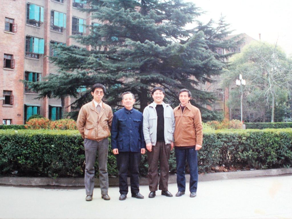 1987年学校中心大楼前(右起姚汉金、汤桐业、周春麟,左1为作者本人)