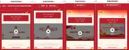 学生领读明史有声。充分发挥学生党员在理论素养、党性修养方面的“头雁”作用和“领航”功能,深入推进“党员思想家”计划,在机械红色加油站平台打造“四史小讲坛”朋辈宣讲云微栏,引导学生党员聚焦党史、中国精神、中国制度等主题录制微视频,已录制《两弹一星科教兴国》《乡村振兴》《新中国的航母梦》等40余期微视频;聚焦《共产党员应知的党史小故事》党史书籍录制有声读物,已录制《李四光:把入党作为生命新起点》《邓颖超的两份遗嘱》《任弼时:时刻把群众利益放在心上》《彭德怀的“四个不准”》等30余期微音频,鼓励学生党员全员“开讲”,用理想和信仰之光凝聚群众。
