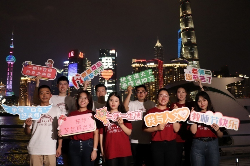 9月9日晚,我校师生代表前往外滩参加教师节庆祝活动,并结合校庆70周年,录制“七秩东华,师恩难忘”微视频向全市教师送上诚挚祝福,大家在热烈的氛围中共同庆祝教师节。