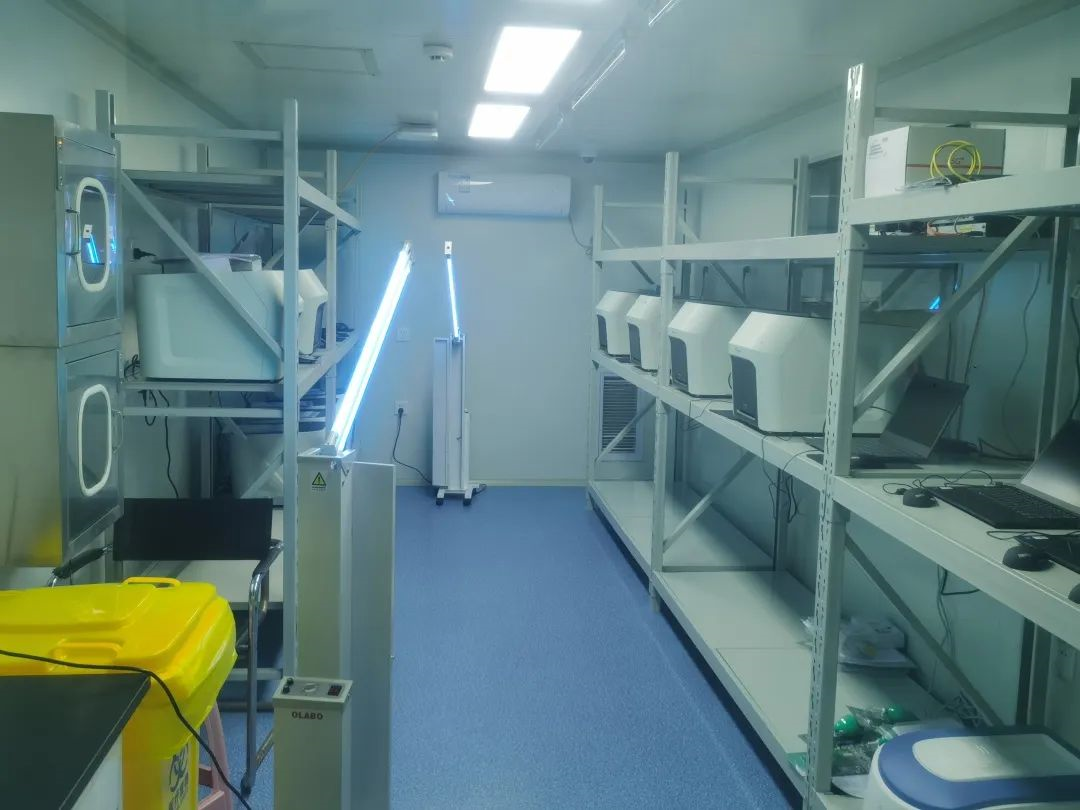 形似小方舱的校园PCR实验室,总面积达570平方米,其中核心PCR实验室面积为108平方米,其余为耗材仓库、办公区及普通实验室等。该实验室设置3个带独立缓冲的标准PCR分区,以及独立污物通道区,并设置独立的人流、物流及污物流通道。