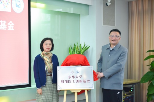 李炜、化学与化工学院院长武培怡为“周翔院士创新专项基金”揭牌。武培怡代表学院发言。